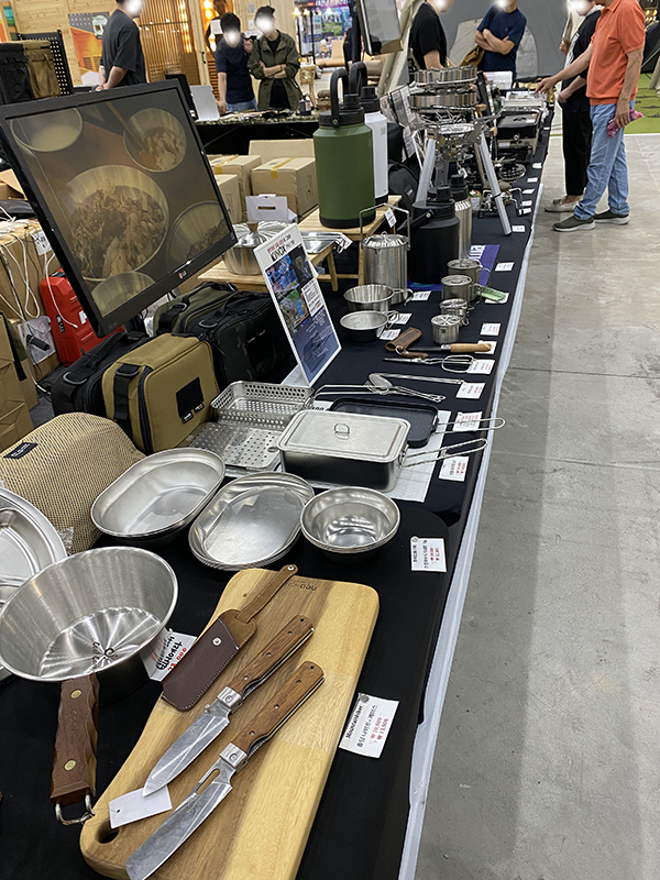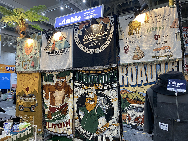 그 옆에는 버너와 식기들을 포함한 주방용품부터 각종 화롯대, 그리고 수납용 가방들도 진열되어 있었습니다. 그리고 캠프로그 스튜디오라는 브랜드의 캠핑 의상들도 눈에 띄었습니다. 다음 부스에서 멈출 수 밖에 없었던 것이.. 림블이라는 브랜드였습니다. 개인적으로 여러 가지 디자인이 되어 있는 블랭킷을 좋아하는데 정말 다양한 종류의 제품들을 만나볼 수 있었습니다. 바닥, 야전침대, 또는 캠핑의자에도 덮어서 사용할 수 있을 것 같아 보였습니다. 사이즈도 다양해서 용도에 맞춰서 구매가 가능 했습니다.